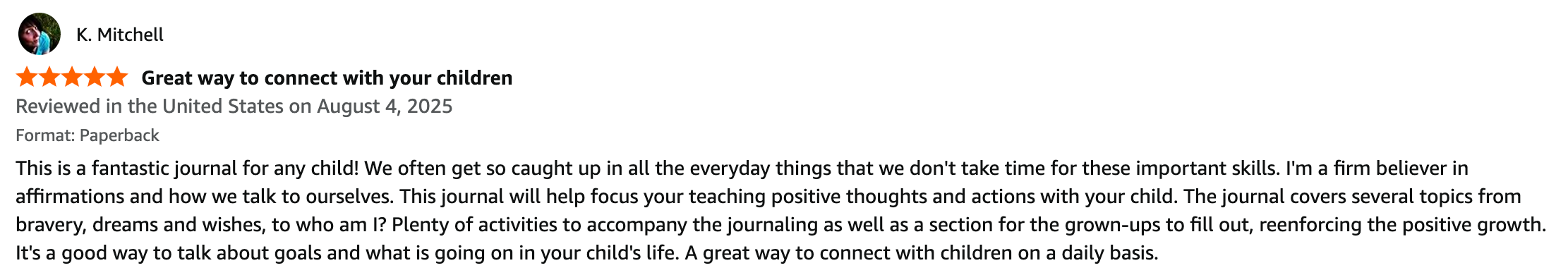 I shared this journal with my daughter, and she absolutely loved it! Watching her engage with the activities and affirmations was a joy, and it even earned me some cool points for being a cool Dad! Seeing her light up with confidence made this book an even more special experience for both of us.